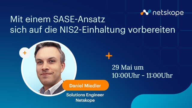 Nehmen Sie an unserem bevorstehenden Webinar mit Daniel Miedler, Solutions Engineering und Cybersecurity-Stratege von Netskope teil. Erfahren Sie, wie ein Secure Access Service Edge (SASE)-Ansatz den Weg zur Einhaltung der neuen europäischen NIS2-Richtlinie rationalisieren kann.