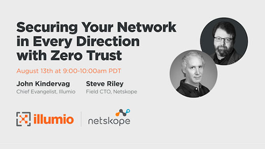 Nach dieser Diskussion nehmen Sie an einem Gespräch zwischen Haider Jarral, Lead Technologist bei Illumio, und Gary Jenkins, Principal Solutions Architect bei Netskope, darüber teil, wie die Integration von Illumio und Netskope es Netzwerk- und Sicherheitsteams ermöglicht, Zero-Trust-Richtlinien zu erstellen, die den Zugriff am Perimeter eines Unternehmens und innerhalb seiner hybriden Multi-Cloud-Infrastruktur konsistent sichern.