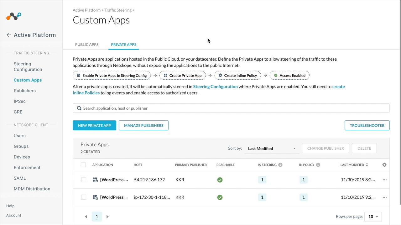 Netskope One Private Access es una solución de acceso a la red de confianza cero basada en la nube que proporciona un acceso rápido y seguro a aplicaciones privadas alojadas en nubes públicas o centros de datos empresariales.