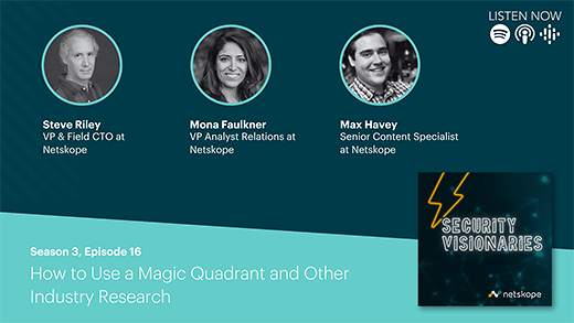 Max Havey Hola, y bienvenidos a otra edición de Security Visionaries, un podcast sobre el mundo de la cibernética, los datos y la infraestructura tecnológica, que reúne a expertos de todo el mundo y de distintos ámbitos. Soy su anfitrión Max Havey, Especialista Senior en Contenidos de Netskope, y hoy hablamos de la investigación de analistas. Ahora es casi seguro que ha escuchado los nombres de muchas firmas de analistas diferentes a medida que se publica la investigación a lo largo del año. Cosas como el Cuadrante Mágico de Gartner, The Forrester Wave™, el IDC MarketScape, todas ellas ilustran cuál es la posición de los proveedores en lo que respecta a las capacidades clave que buscan los consumidores. Con eso en mente, he traído a algunos invitados que tienen experiencia en este mundo, y específicamente en el Cuadrante Mágico de Gartner, para que nos cuenten un poco más sobre este tipo de creaciones de analistas y cómo funcionan. En primer lugar, tenemos a Steve Riley, un antiguo analista de Gartner que ayudó a redactar una serie de notas de investigación en su tiempo allí, incluyendo el Cuadrante Mágico para CASB, y la Guía de Mercado para ZTNA. Bienvenido, Steve.