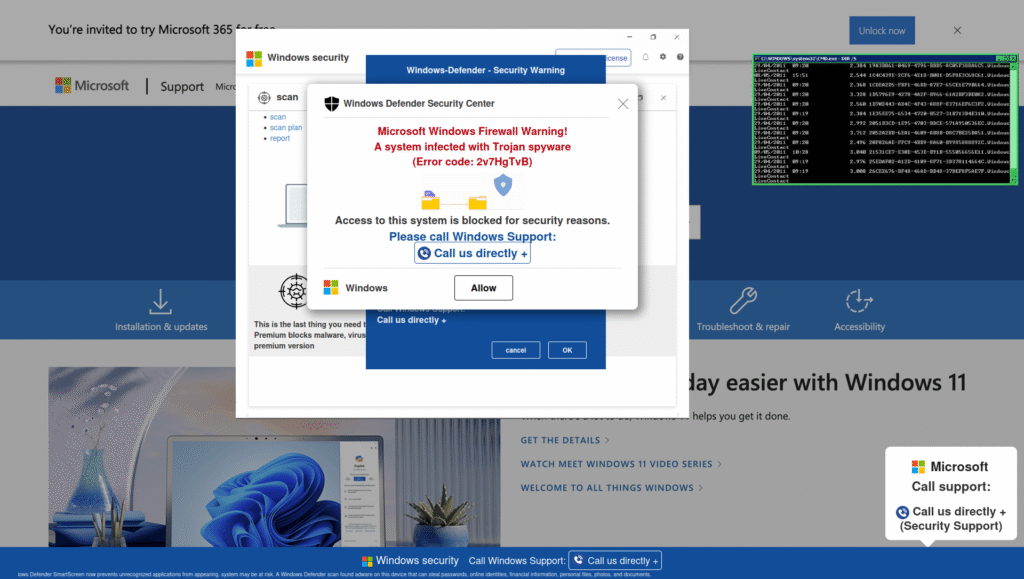 - Widespread impact: The tech support scam campaign had a significant initial impact, affecting users across 48 different organizations in the U.S. within a short timeframe. Victims were identified across multiple sectors, including healthcare, manufacturing, and technology.