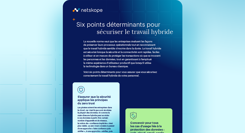 Le travail hybride est sécurisé lorsque la sécurité et la connectivité sont rapides, faciles à utiliser et en mesure de protéger les transactions où que se trouvent les personnes et les données, tout en garantissant à l'employé la même expérience d'utilisateur productif que lorsqu'il utilise la technologie dans un bureau d'entreprise traditionnel.