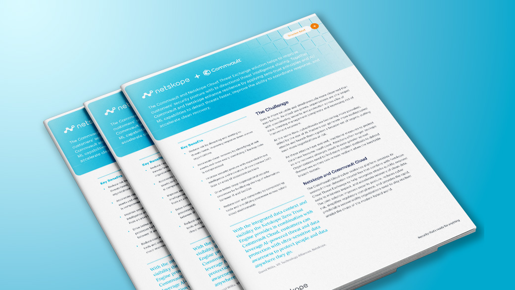 The Commvault and Netskope Cloud Threat Exchange solution helps to improve customers’ security posture with bi-directional threat intelligence sharing. Together, Commvault and Netskope enhance resilience by applying zero-trust principles and AI/ML capabilities to detect threats faster, improve the ability to coordinate response, and accelerate clean recovery.